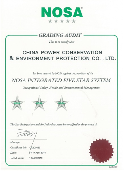 7月13日,經(jīng)過NOSA科學、嚴格地考評,國能中電被正式授予“NOSA五星管理系統(tǒng)”三星級證書。