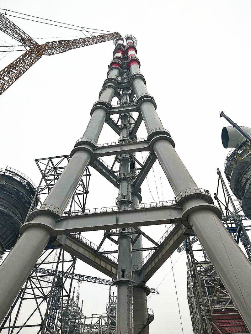 項目配套的三管自立式鋼煙囪,是國能中電引進日本三菱多管自立煙囪技術,并整合了日本鈦板貼襯技術建設而成,煙囪內(nèi)徑4.5米,高度180米,分7層,總重2108t。三管自立式鋼煙囪結(jié)構(gòu)合理、造型美觀。三根鋼管煙囪按正三角形布置,通過三角形鋼梁進行剛性連接,形成集束式穩(wěn)定結(jié)構(gòu),每個煙囪由多個直段拼接成流線型曲線。通過整體空間結(jié)構(gòu)來共同抵抗地震荷載、風荷載及其它荷載,整個煙囪結(jié)構(gòu)形體規(guī)則,各向受力均勻,造型簡潔、美觀,全面融入了現(xiàn)代氣息和建筑美學的設計理念。自2018年8月12日開始施工建設,采用SCC9000/900噸履帶式起重機分七段進行吊裝,在參建各方的共同努力下,歷時135天,于2018年12月25日順利吊裝到頂。