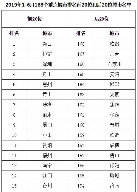 2019年1-6月,168個重點城市中臨汾、邢臺、石家莊市等20個城市空氣質量相對較差(從第168名到第149名);海口、拉薩、深圳市等20個城市空氣質量相對較好(從第1名到第20名,見附表2)。
