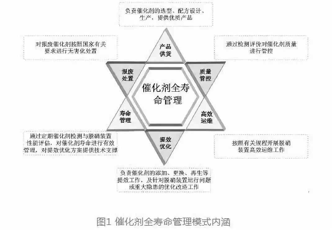 早期管理模式—主要應對環(huán)保達標排放以及技改工程限期治理要求,在早期大規(guī)模工程改造以及催化劑市場供不應求的形勢下,僅僅是單純粗放式的工程階段設備“買+ 裝”模式,缺乏對催化劑產品質量的管控。現(xiàn)行管理模式—鑒于早期管理模式在工程投運后產生的一系列問題,近年來發(fā)電企業(yè)對催化劑質量加強了管控,初步形成了“買+ 檢+ 裝+ 不定期檢”的模式,但由于缺乏連續(xù)性與整體性考慮,未能充分調動各方單位的參與度,責任單位往往在于發(fā)電企業(yè),相關工作開展較為被動,難以實現(xiàn)對催化劑全壽命周期的采購質量、運行壽命以及脫硝運維成本的有效管控。