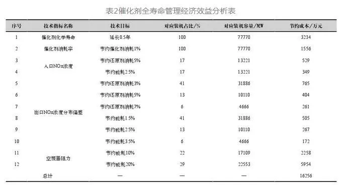 以某1000MW機組為例,假設能夠將催化劑化學壽命由3年延長至3.5年、節(jié)約還原劑耗量5%、降低脫硝及空預器運行阻力300Pa,則可年節(jié)約催化劑成本50萬元、還原劑成本40萬元、能耗(水、電、汽耗)成本160萬元,總計可節(jié)約脫硝運行成本250萬元/年。假設國內某發(fā)電集團192臺77770MW SCR脫硝機組催化劑統(tǒng)一實施全壽命管理模式后,基于當前運行現(xiàn)狀,通過折算對應裝機的催化劑采購成本、還原劑消耗成本、能耗成本,如表2所示,可節(jié)約脫硝運行費用約1.63億元/年。因此全壽命管理模式實施后,將能夠有效提升脫硝裝置運行可靠性、減少脫硝裝置運行成本。